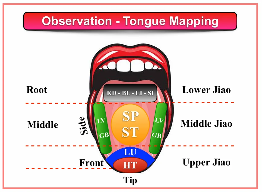 A standout feature in TCM is tongue diagnosis, which provides insights into the internal state of organs. The tongue is a fantastic example of reading the body’s signals. The tongue is examined based on: